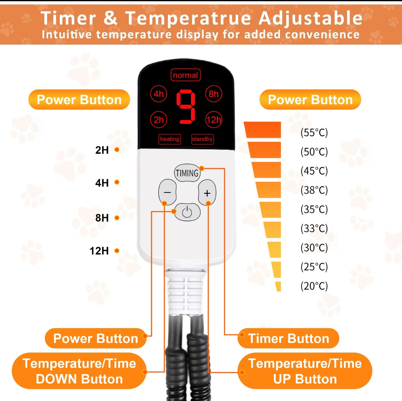 🐶Heating pad for pets with timer: The electric heating pads for cats with timer function offer an automatic shut-off range of 2/4/8/12 hours, saving energy and preventing burns from excessive heating.